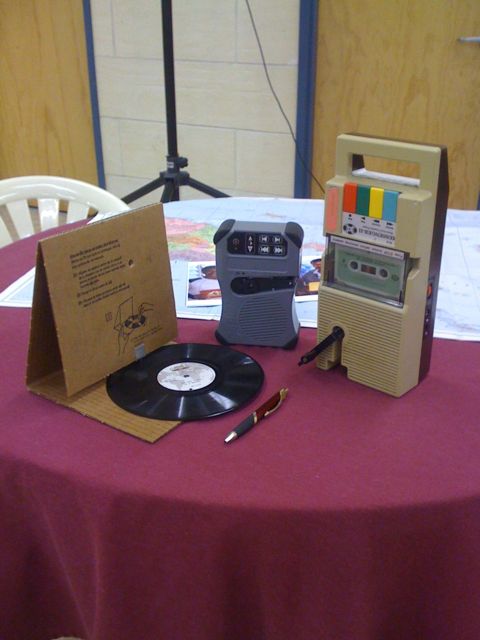 We were shown a gospel recording on a black vinyl record. Alex demonstrated a cardboard record player that produced remarkable sound. Then we saw a hand cranked audio cassette player. Finally we were shown an mp3 player that operates by a hand crank, which when wound for five minutes provided thirty minutes of playing. It holds fifty hours of recorded material. A one gigabite SD card can also be plugged into the mp3 player. It also can be plugged into other power sources. The mp3 unit is the middle one in the picture below.