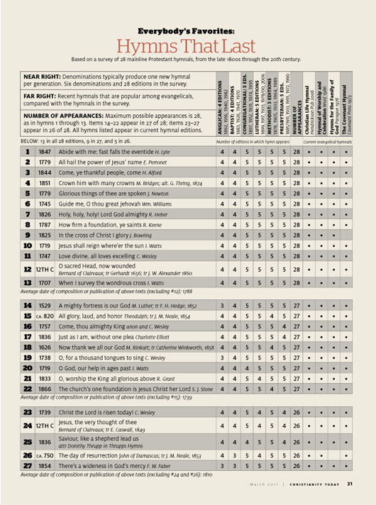 From Christianity Today Online comes an article about ‘The Hymns That Keep On Going’ accompanied by the chart below listing twenty-seven hymns that have remained constant inclusions in various hymnals and their subsequent editions over scores of years.
