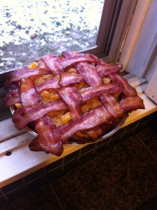 Take this picture of a Colby Jack Mac and Cheese Pie With a Bacon Crust as hint of the culinary inspiration at the blog Dude Food.