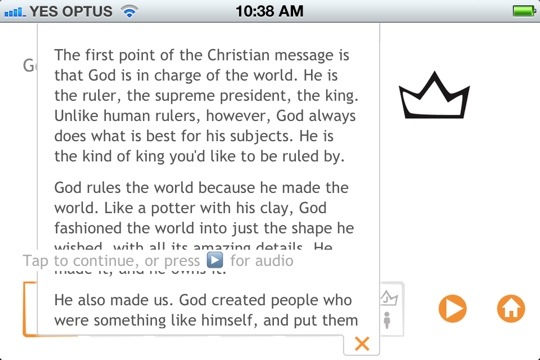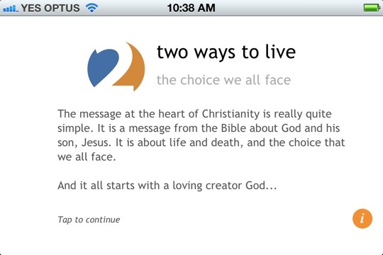So we’ve made Two Ways to Live into an app for the iPhone/iPad/iPod Touch. It’s the same clear, challenging outline of the Christian gospel that we’ve been producing for years, but in this case you can whip your phone out and step through the presentation with a friend, filling in the explanation yourself, or you can give it to someone else for them to explore. There’s extra text that explains each of the points in more detail, and an audio version voiced by Kel Richards. It’s even available in a few different languages, selectable from within the app itself (currently English, Japanese, French, Spanish, and (simplified) Chinese; we’ll add more as we’re able).
