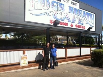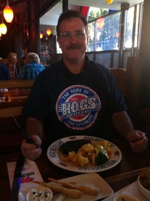 Hog’s Breath slow-cooked steak with smokey BBQ sauce, curly fries, veg with cheese sauce.