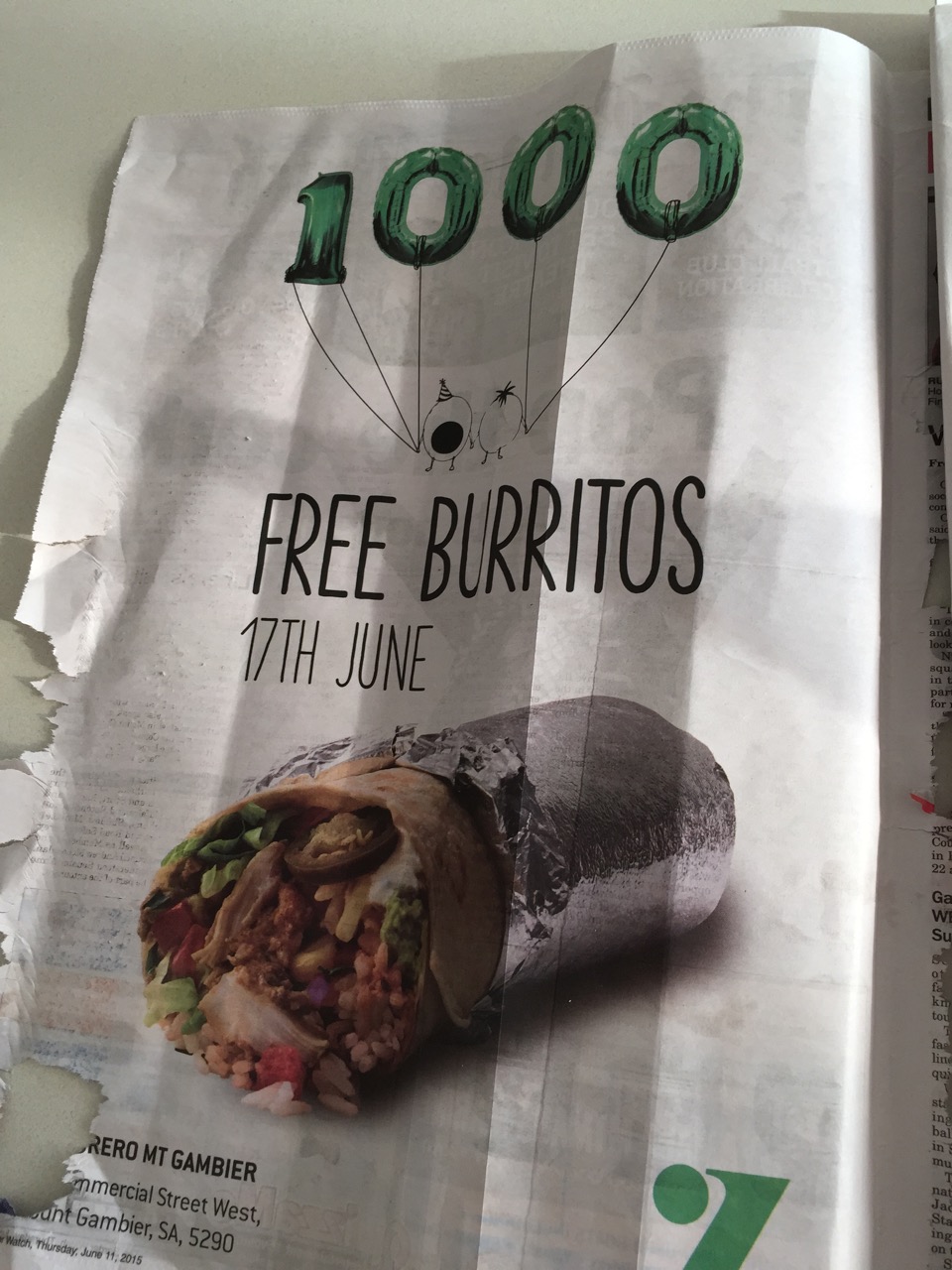 Mount Gambier Next Wednesday Gary Ware no comments June 11, 2015 Zambrero opens a store in Mount Gambier on June 17. There may be a riot. One each. (My daughter sent me the pic, taken from a communal copy of the paper at her workplace. It looks like someone started eating the paper.) Share this: Share on Facebook (Opens in new window) Facebook Share on X (Opens in new window) X Share on Reddit (Opens in new window) Reddit Email a link to a friend (Opens in new window) Email Print (Opens in new window) Print Like Loading... Related