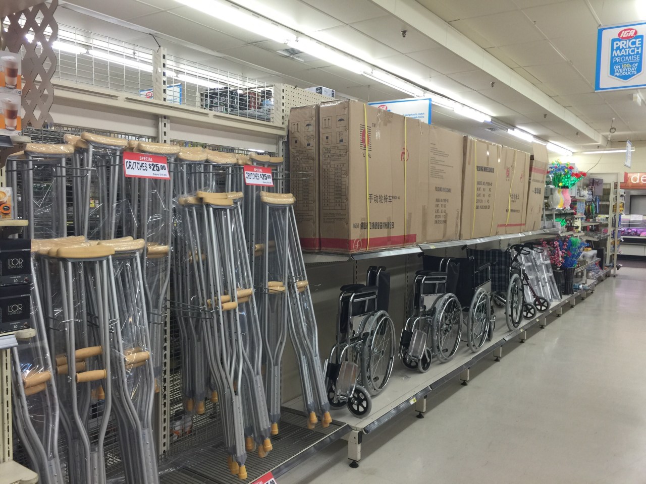 Bread, Milk, Wheelchair Gary Ware no comments August 3, 2015 The IGA supermarket in Maryborough (QLD) has an aisle dedicated to crutches, walking frames and wheelchairs. Apparently they know their market. Share this: Click to share on Facebook (Opens in new window) Facebook Click to share on X (Opens in new window) X Click to share on Reddit (Opens in new window) Reddit Click to email a link to a friend (Opens in new window) Email Click to print (Opens in new window) Print Like Loading... Related