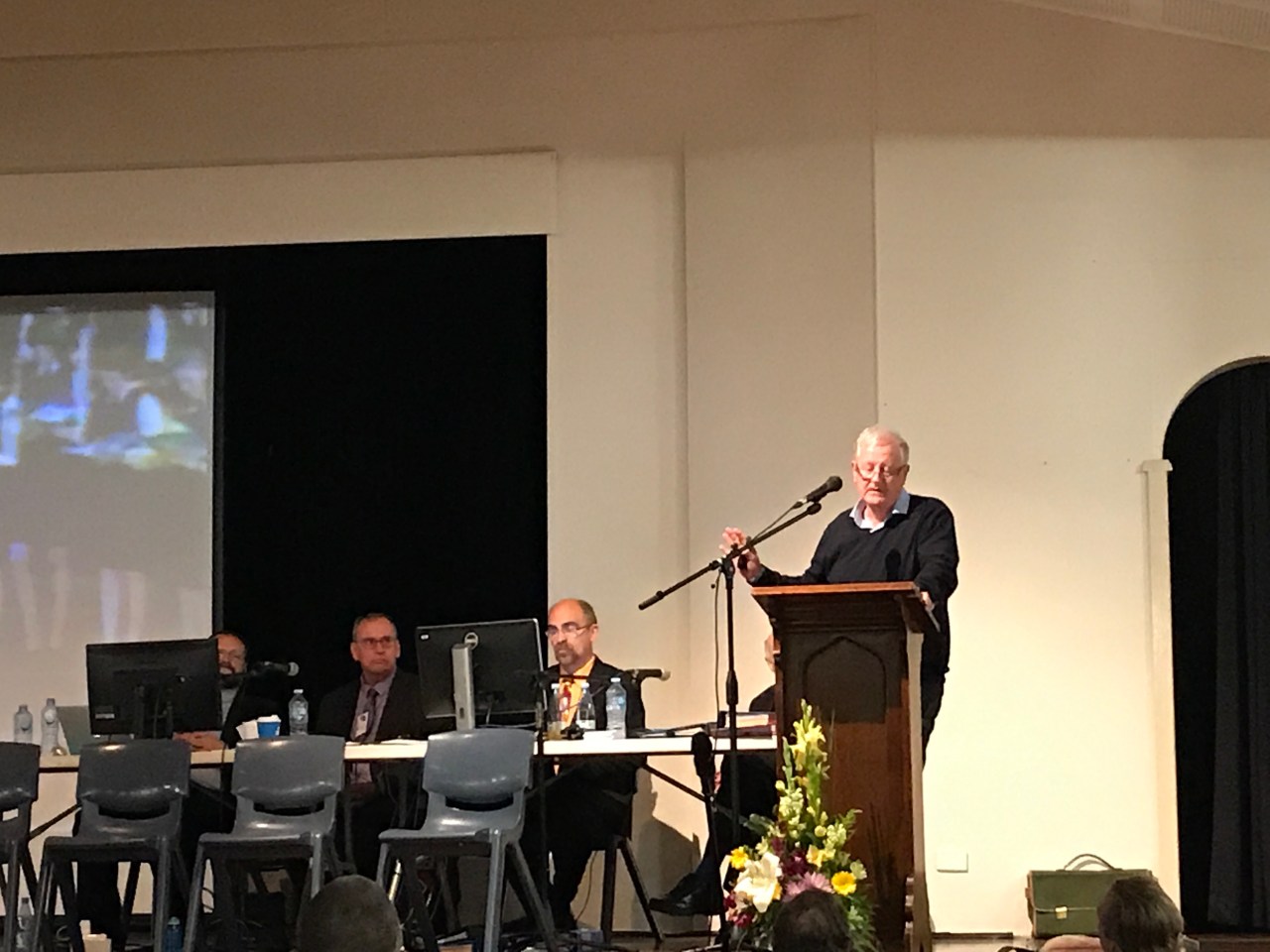 Kevin Murray speaking about the past 40 years of world mission. In 1977 those serving in mission went from over 100 to 4. The Presbyterian church responded by recognizing Presbyterians who had been serving with evangelical bodies because the denomination had no interest in them. Now close to 200 are recognized, along with partnerships with a number of denominations.