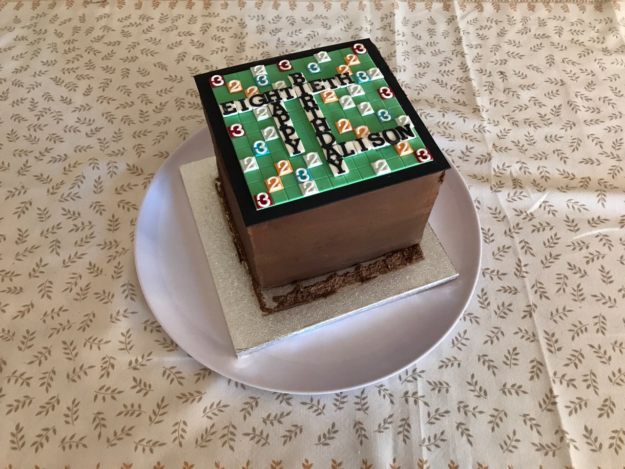 A special Scrabble cake for Alison Cunningham, a very special and dear lady who has been a wonderful mother in law to me for 34 of her 80 years.