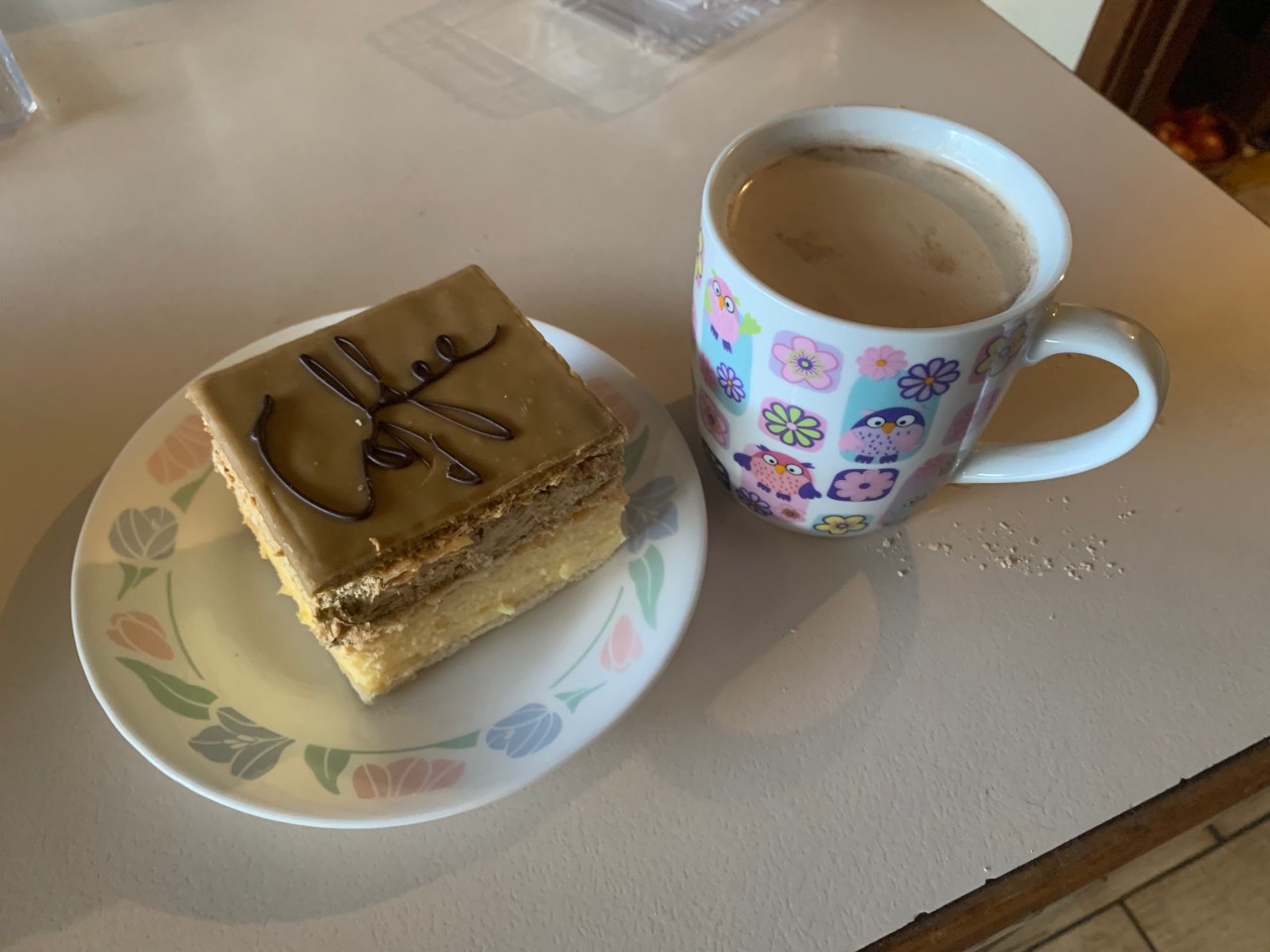 Trialing the coffee vanilla slice from local shop Sugar and Spice.