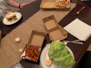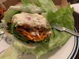 I chose Tropical with grilled chicken wrapped in lettuce instead of a bun with sweet potato wedges. It was almost health food.