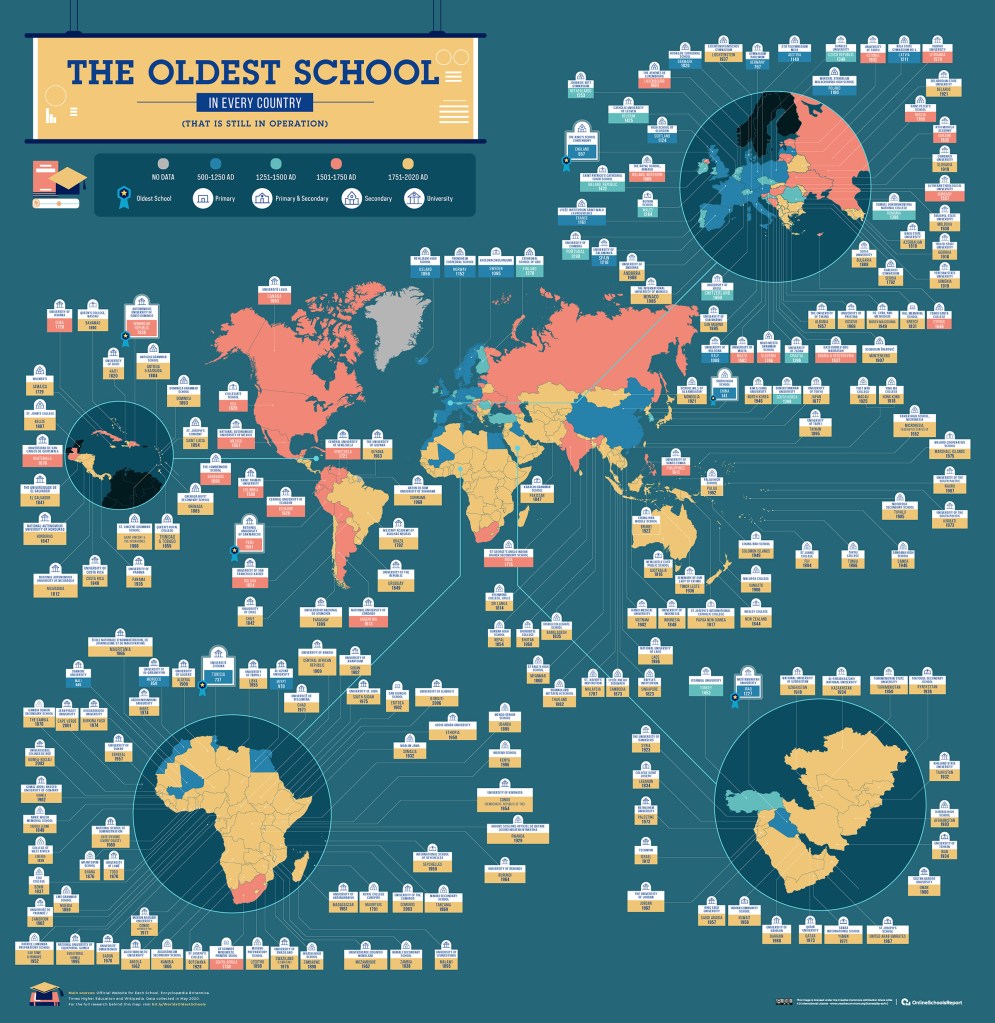 This infographic identifies each country’s oldest school or university still in operation.