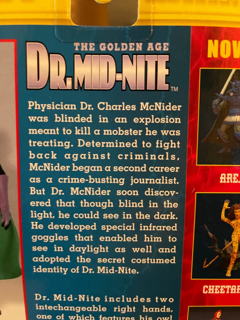 I was going to tell you his backstory, but it was printed on the back of his packaging. Of interest is that the character was blind (though able to ‘see’ after a fashion in heroic guise) And had an owl called Hootie.