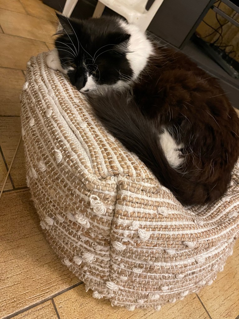 The cat has never slept on this foot rest. Until tonight. I’m never sure whether she’s a random cat or a cat with tastes for random resting places. Or both.