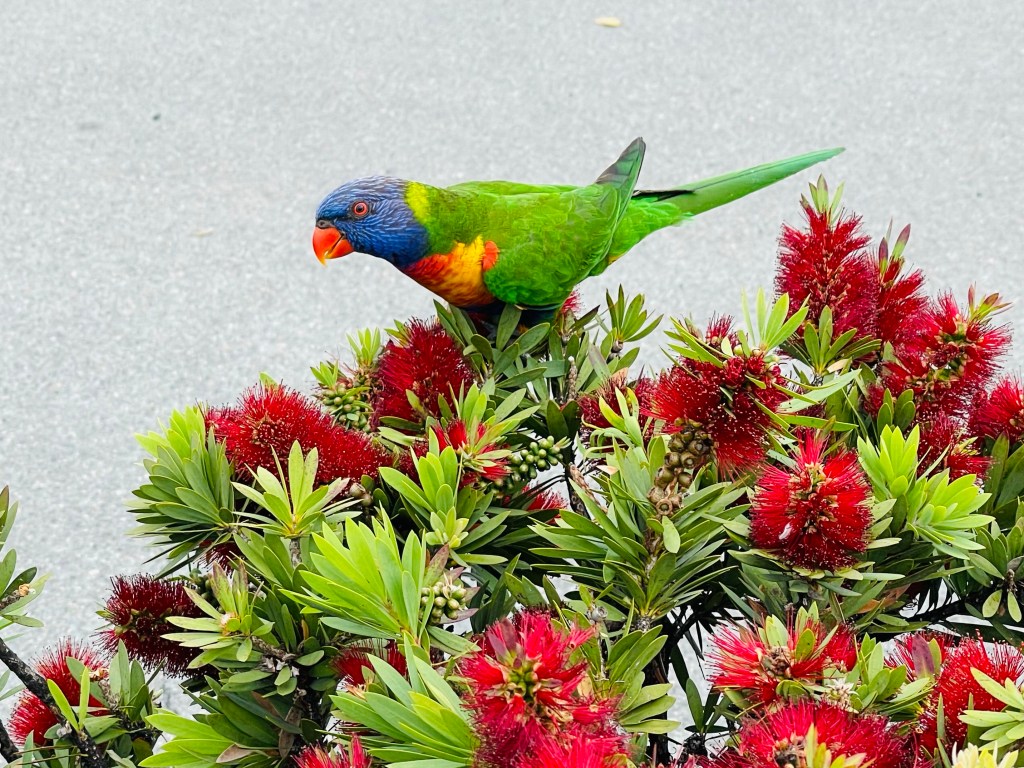 This was one of many lorikeets that were moving along a hedge as we walked the path beside them. This one was willing to be close enough long enough for a photo.