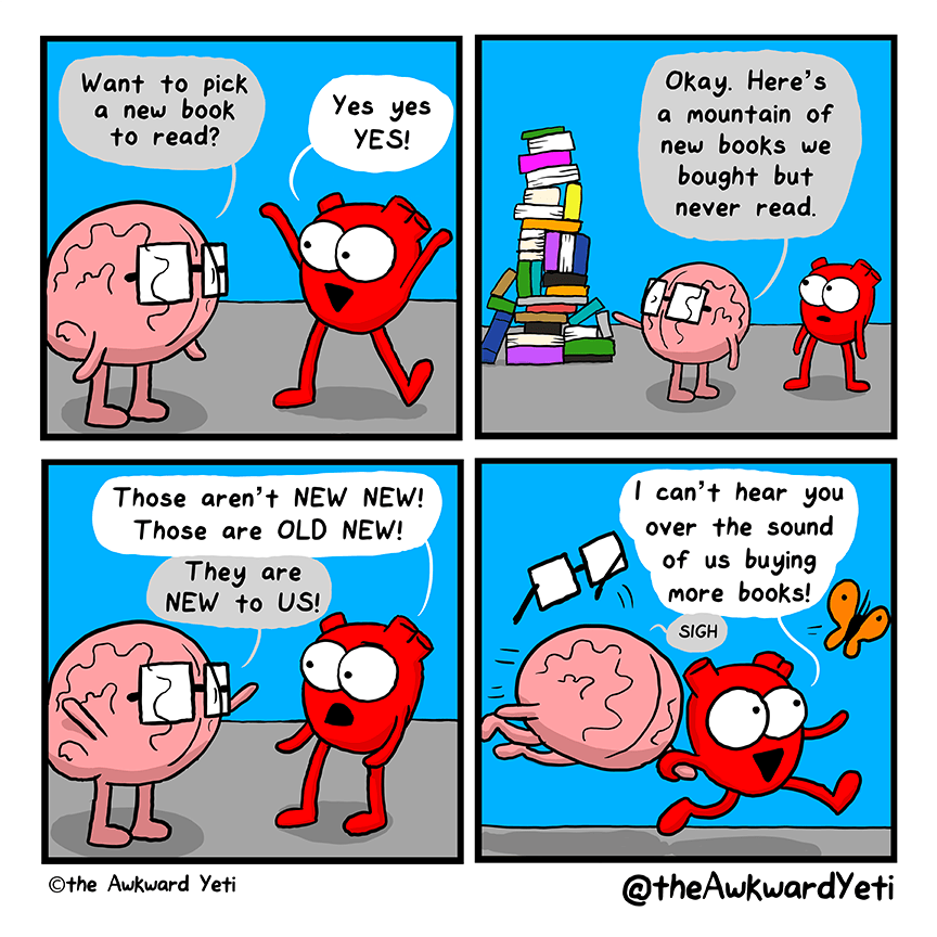 Old Old Books, Old New Books, New New Books (via Awkward Yeti) Gary Ware no comments August 22, 2023 This cartoon from Awkward Yeti explains the situation with purchasing more books perfectly. Share this: Click to share on Facebook (Opens in new window) Facebook Click to share on X (Opens in new window) X Click to share on Reddit (Opens in new window) Reddit Click to email a link to a friend (Opens in new window) Email Click to print (Opens in new window) Print Like Loading... Related