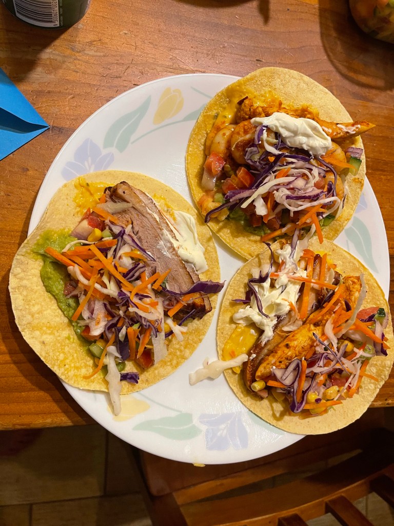 Currently enjoying tacos as a family meal because there are enough variations to accommodate everyone’s dietary needs and preferences.